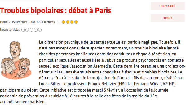 la projection d’un court-métrage original de sensibilisation(produit par AREMEDIA) principalement destiné aux acteurs de prévention des conduites à risque, suivie d’un débat avec la participation d’un expert reconnu, le Pr Frank BELLIVIER(hôpital Fernand-Widal, AP-HP).